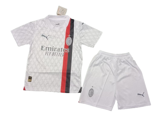 "Dare to be different with the AC Milan 23/24 Youth Away Kit. In a striking and contemporary design, this kit brings a fresh perspective to the iconic Rossoneri colors. Ideal for young fans who want to stand out, the AC Milan Youth Away Kit is not just a jersey – it's a statement. Whether you're in the stands or owning the field, this kit is your ticket to style and allegiance. Unleash your passion for AC Milan with the 23/24 Youth Away Kit – where innovation meets tradition, and the next generation of fans is born."