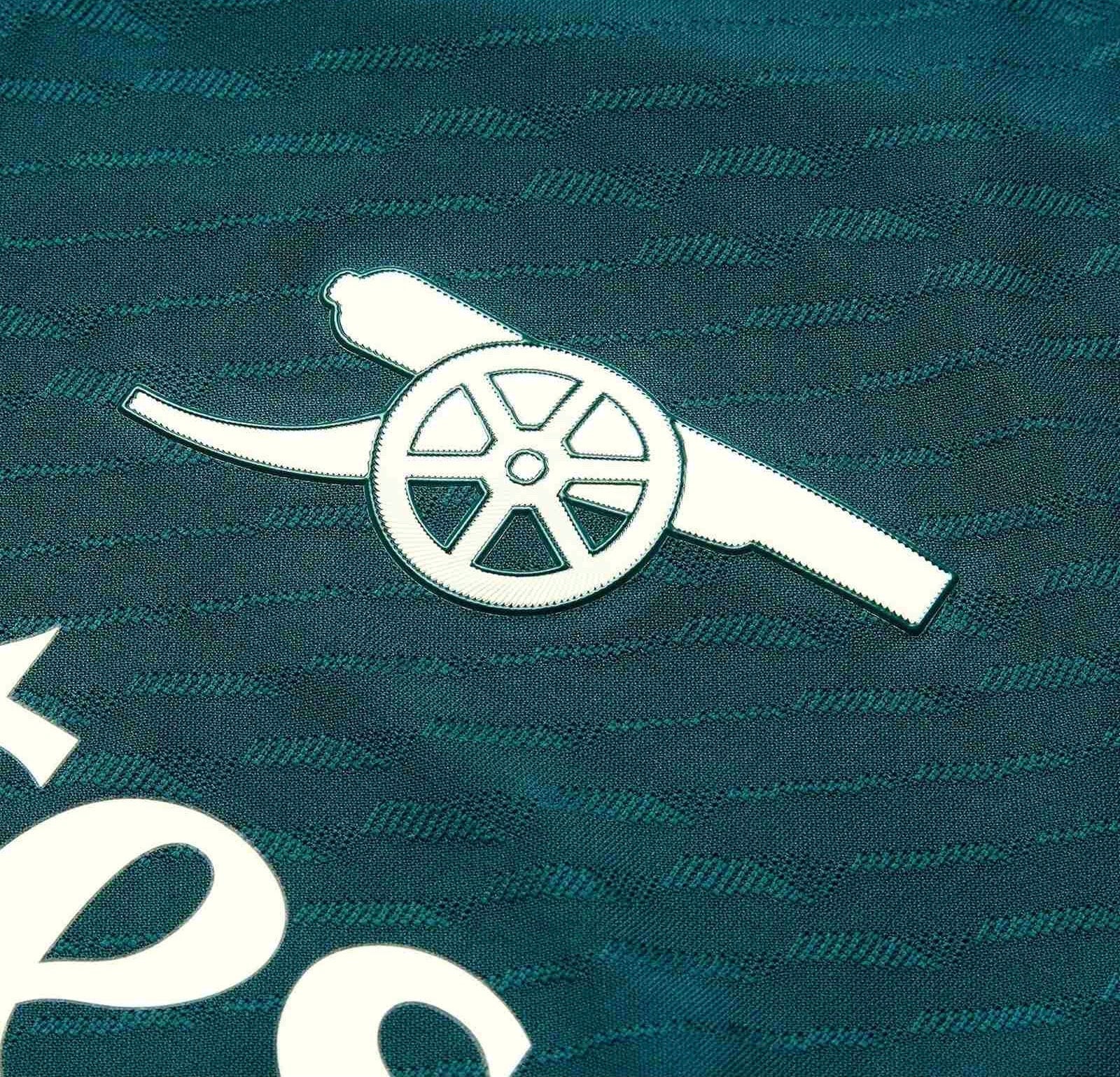 Adorned with the distinguished club crest and the Adidas logo, the Third Jersey stands as a symbol of Arsenal's rich footballing heritage and their continuous pursuit of excellence. The intricate design details, including dynamic patterns and a modern neckline, contribute to the overall aesthetic, creating a jersey that is not only stylish but also unmistakably Arsenal.