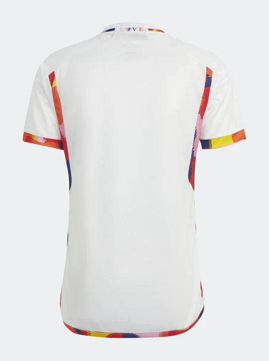The Adidas Belgium 2022 away football shirt showcases a vibrant and eye-catching design. Predominantly white, the jersey features vibrant multicoloured trim on the collar, sleeves, hem, and underarms. This unique design is inspired by the collaborative Adidas x Belgian FA x Tomorrowland "LOVE" capsule collection, resulting in a distinctive aesthetic that reflects the spirit of unity and celebration. Meticulously crafted by Adidas, this shirt ensures both comfort and durability, making it suitable for passionate fans and players alike. Embrace the colourful and dynamic style of the Adidas Belgium 2022 away football shirt as you proudly support the national team in their quest for success on the global stage.