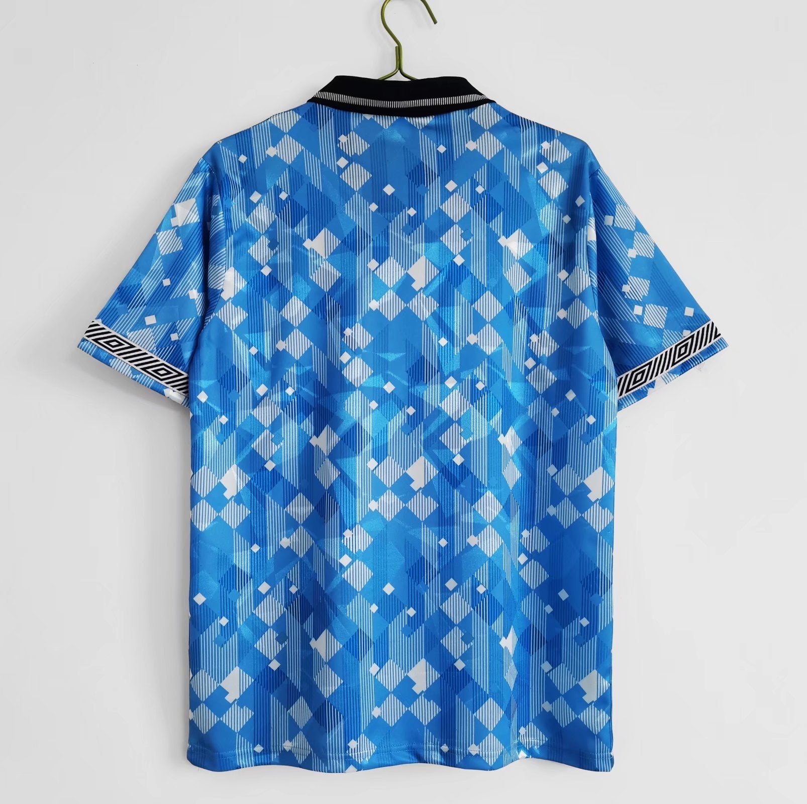 The England 1990 away jersey featured a distinctive design characteristic of the football fashion during that era. The primary color of the jersey may have deviated from the traditional white associated with England's home kits. The design likely incorporated unique elements, possibly patterns or details representative of the stylistic trends of the late 1980s and early 1990s. The England national team crest, symbolizing national pride, would have been prominently displayed on the left side of the chest. Additionally, the jersey would have featured the logo of the kit manufacturer, typically positioned on the right side of the chest or elsewhere.