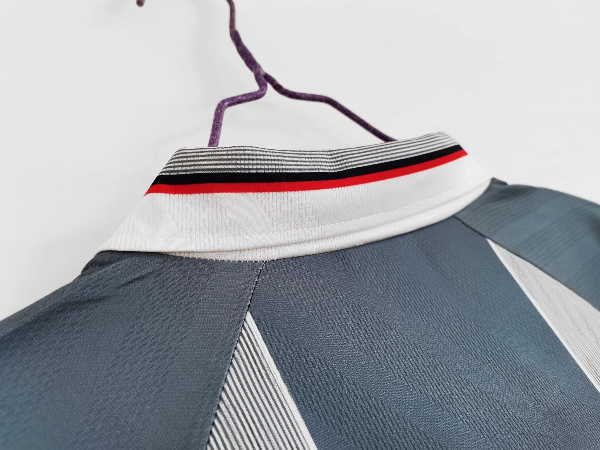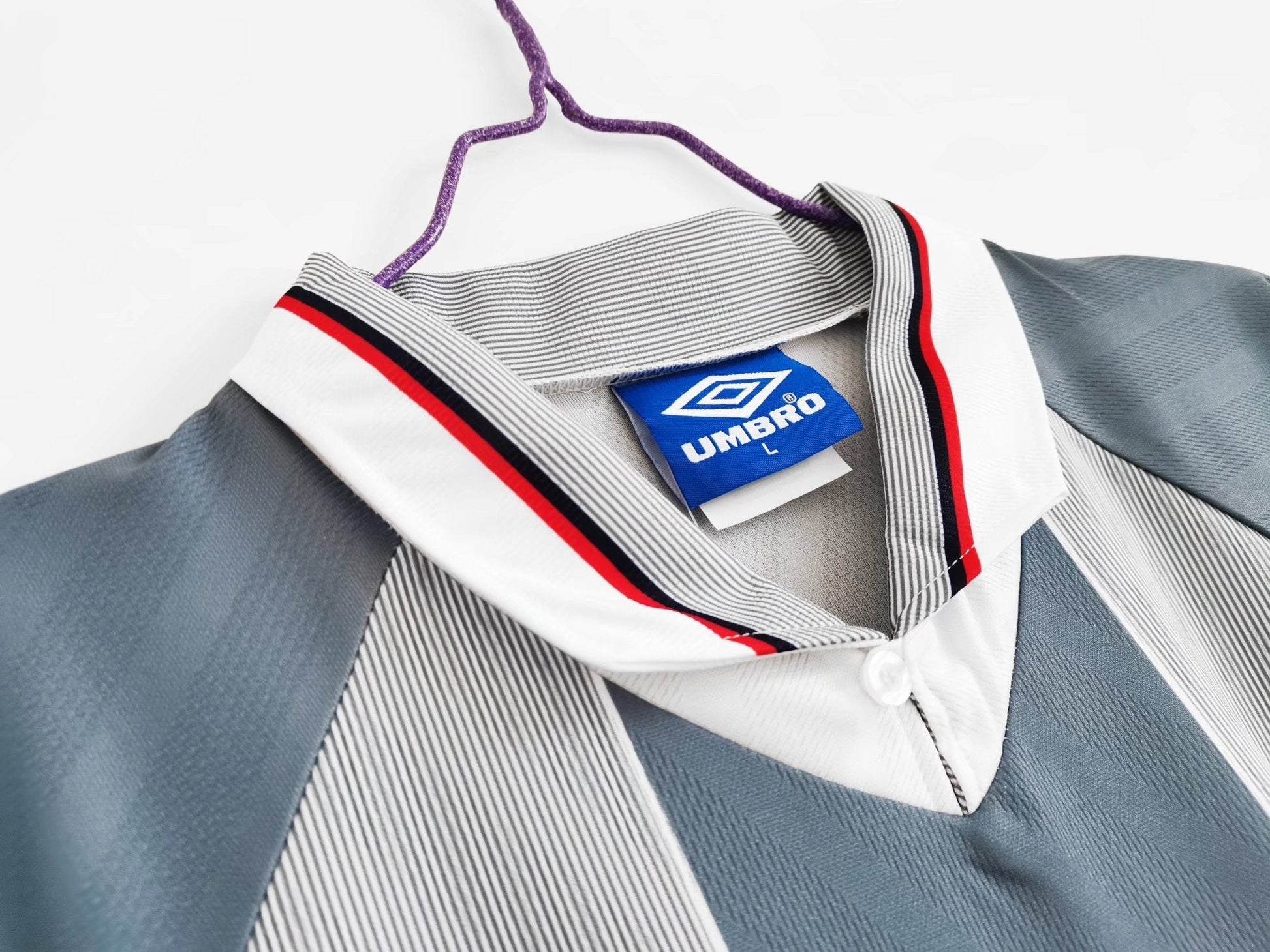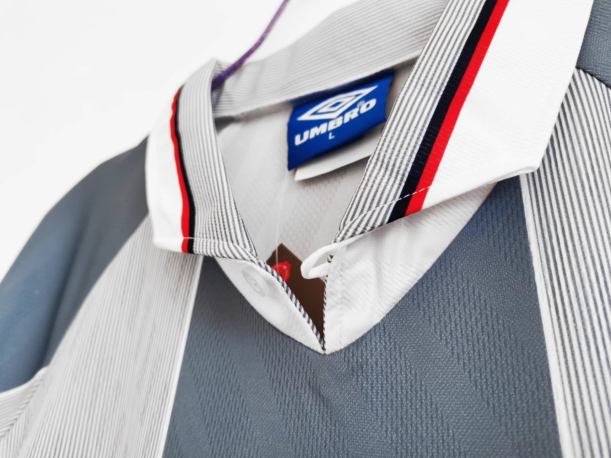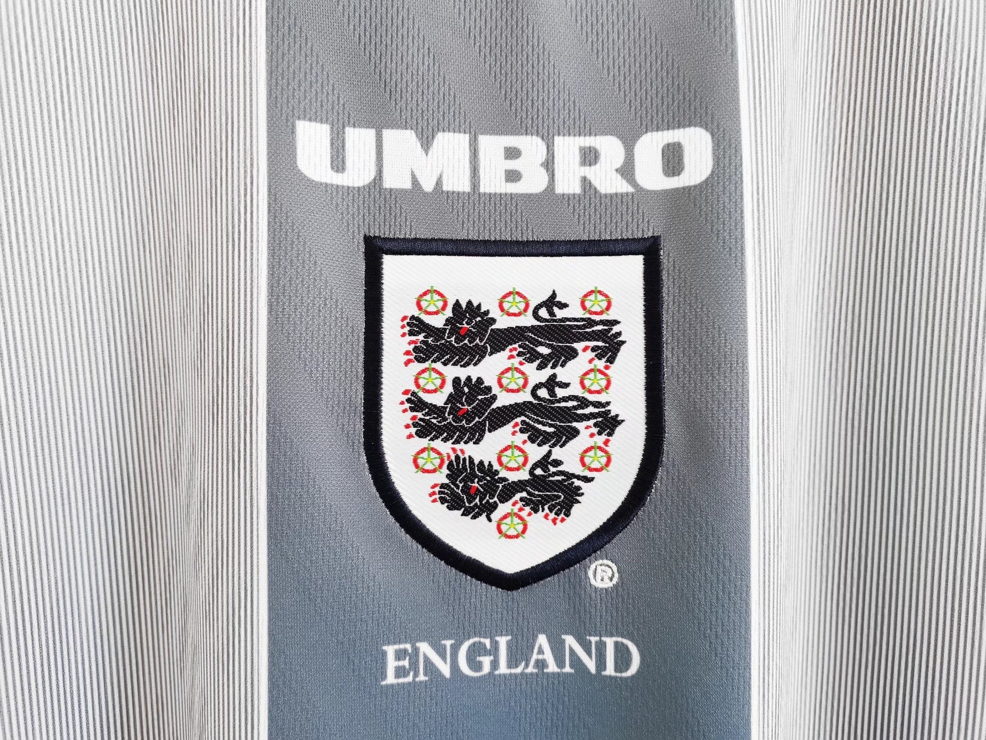 The England 1996 away jersey featured a distinctive design with a primary color that likely deviated from the traditional white associated with the team's home kits. The jersey would have showcased unique design elements representative of the mid-1990s football fashion trends, possibly incorporating patterns or details reflecting that era's style. The England national team crest, a symbol of national pride, would have been prominently displayed on the left side of the chest. Additionally, the jersey would have featured the logo of the kit manufacturer, positioned typically on the right side of the chest or elsewhere.