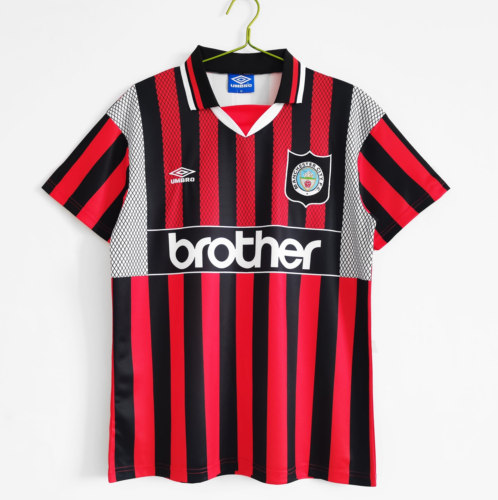 The Manchester City away jersey for the 1994/96 seasons featured a distinctive design typical of that era. The primary color of the jersey was typically a combination of dark blue and black. The jersey likely featured unique patterns or details common in football kits from the mid-1990s, such as stripes, geometric shapes, or other patterns. The Manchester City crest would have been prominently displayed on the left side of the chest, and the shirt would also have featured the team's sponsor at the time. Brother was a prominent sponsor for Manchester City during this period, and their logo would have been visible on the jersey. The jersey would have featured the logo of the kit manufacturer, and during that time, it was often Umbro.