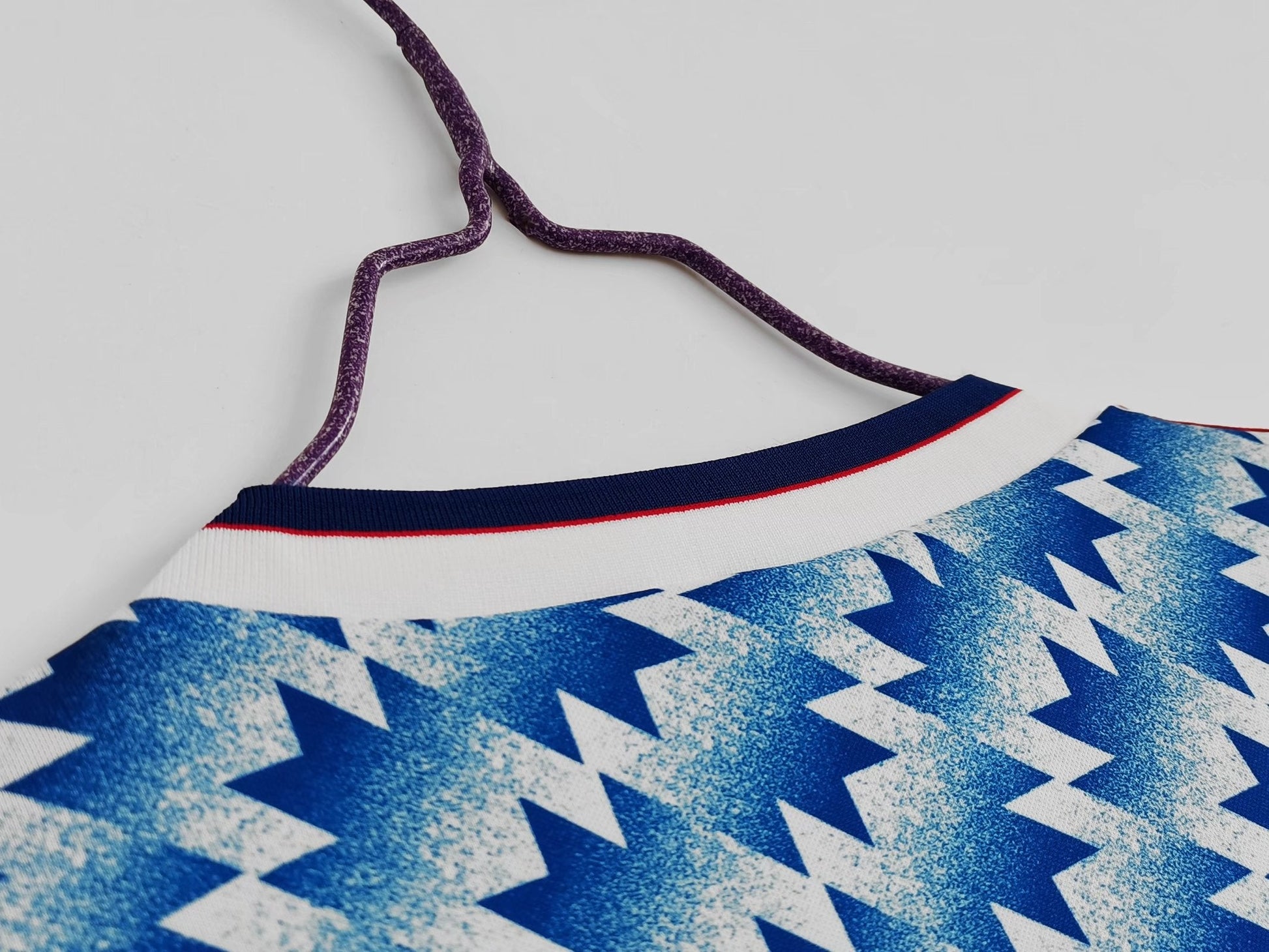 The Manchester United 1990/1992 Away Jersey is a nostalgic piece that transports fans back to a pivotal era in the club's storied history. With a classic design characterized by a unique blend of blue and White, this jersey encapsulates the essence of early '90s football fashion. The addition of long sleeves adds a touch of timeless elegance to the overall aesthetic.