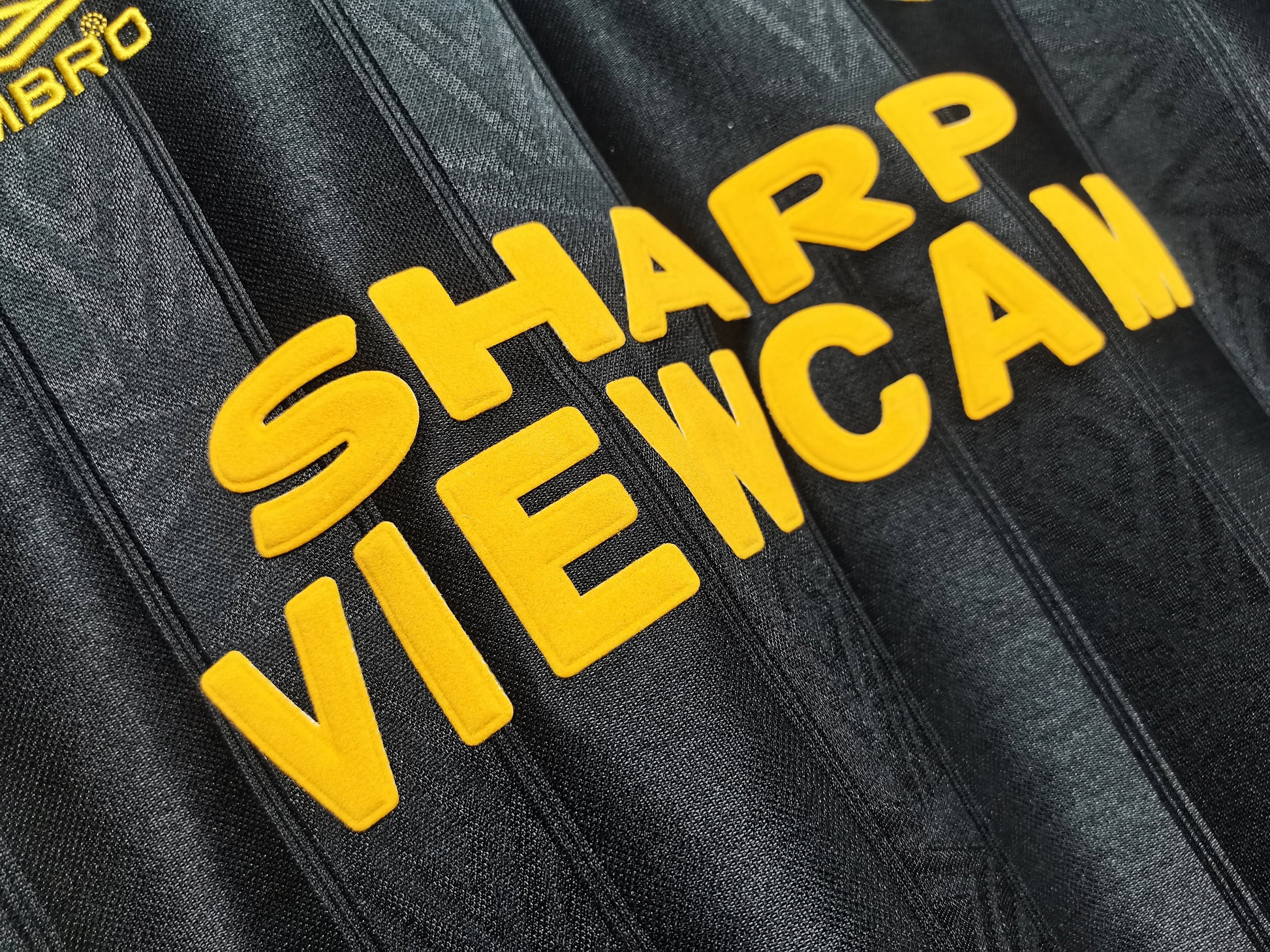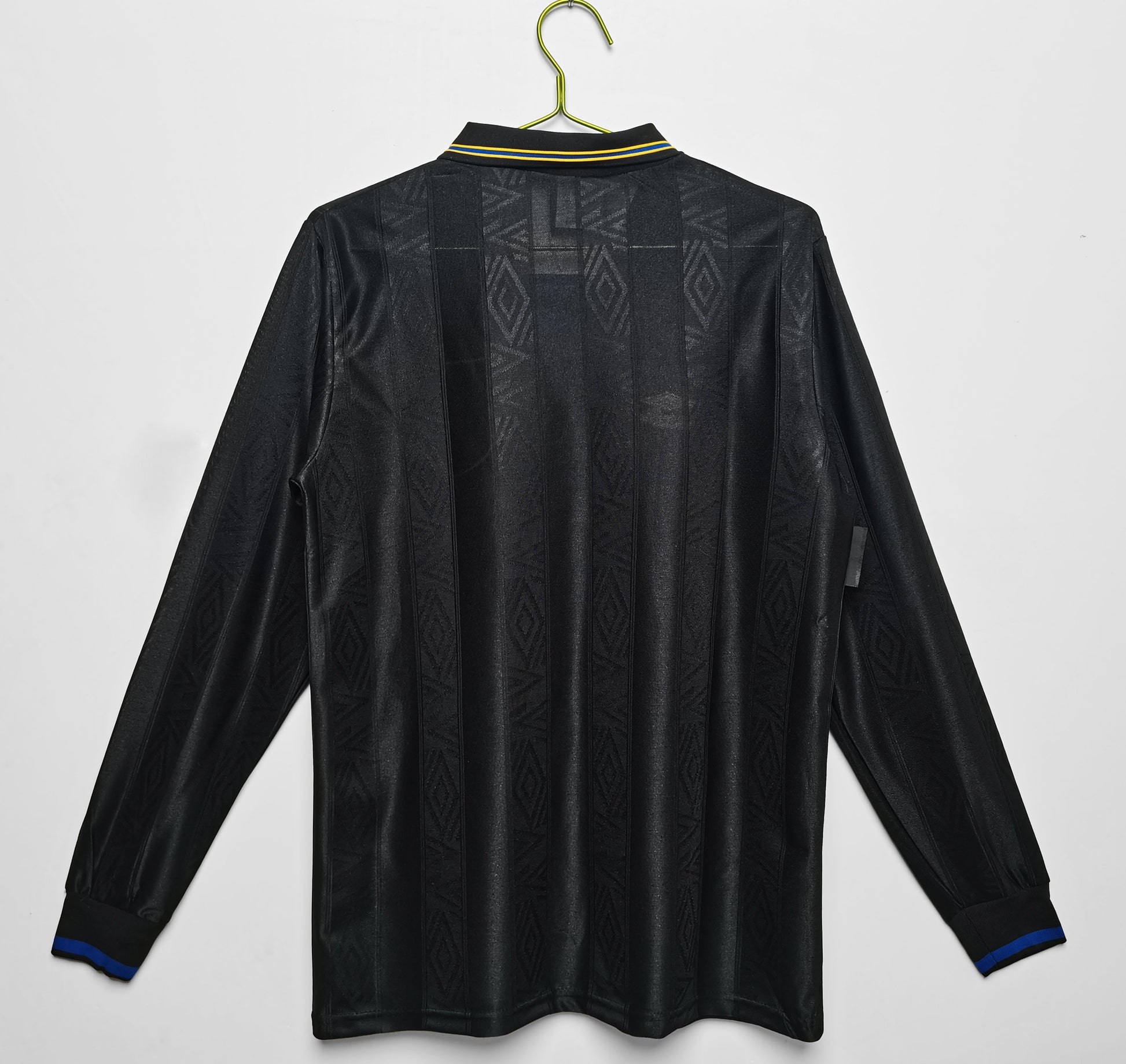 The Manchester United away jersey for the 1993/94 season, particularly the long sleeves version, was a distinctive representation of the club's style during that period. The away kit featured a unique and eye-catching design with a base color of a sharp black, providing a stark contrast to the traditional red of the home jersey.