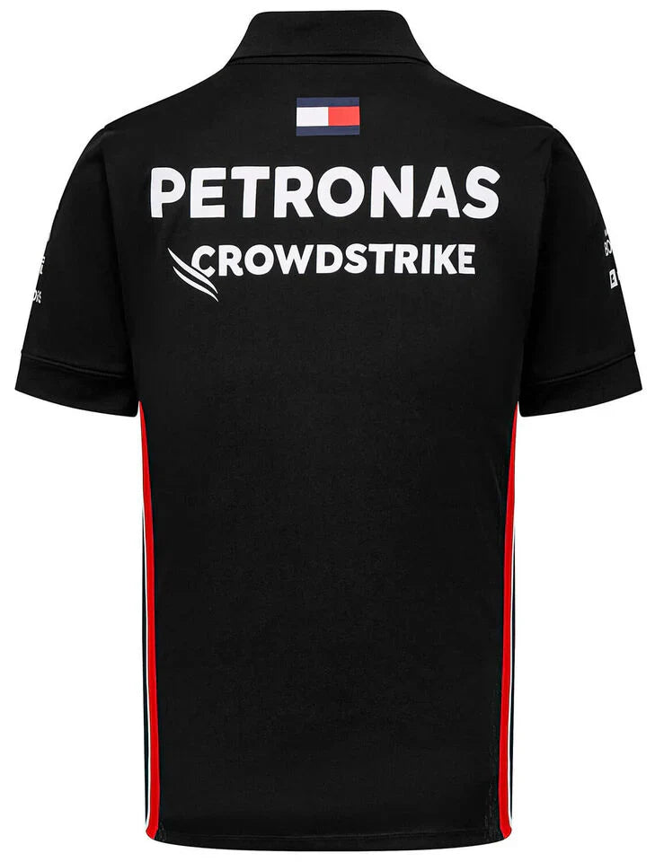 Dressed in a sleek black hue, the polo shirt seamlessly blends modern aesthetics with the rich heritage of Mercedes-AMG, symbolizing the team's commitment to performance, precision, and innovation on the track. The design features the distinctive logos and emblems of the team, creating a bold yet refined look.