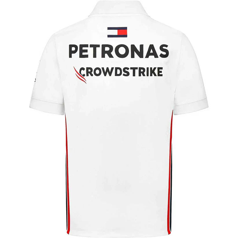 Dressed in a crisp white hue, the polo shirt seamlessly blends modern aesthetics with the rich heritage of Mercedes-AMG, symbolizing the team's commitment to precision, performance, and innovation on the track. The design showcases the distinctive logos and emblems of the team, creating a clean and refined look.