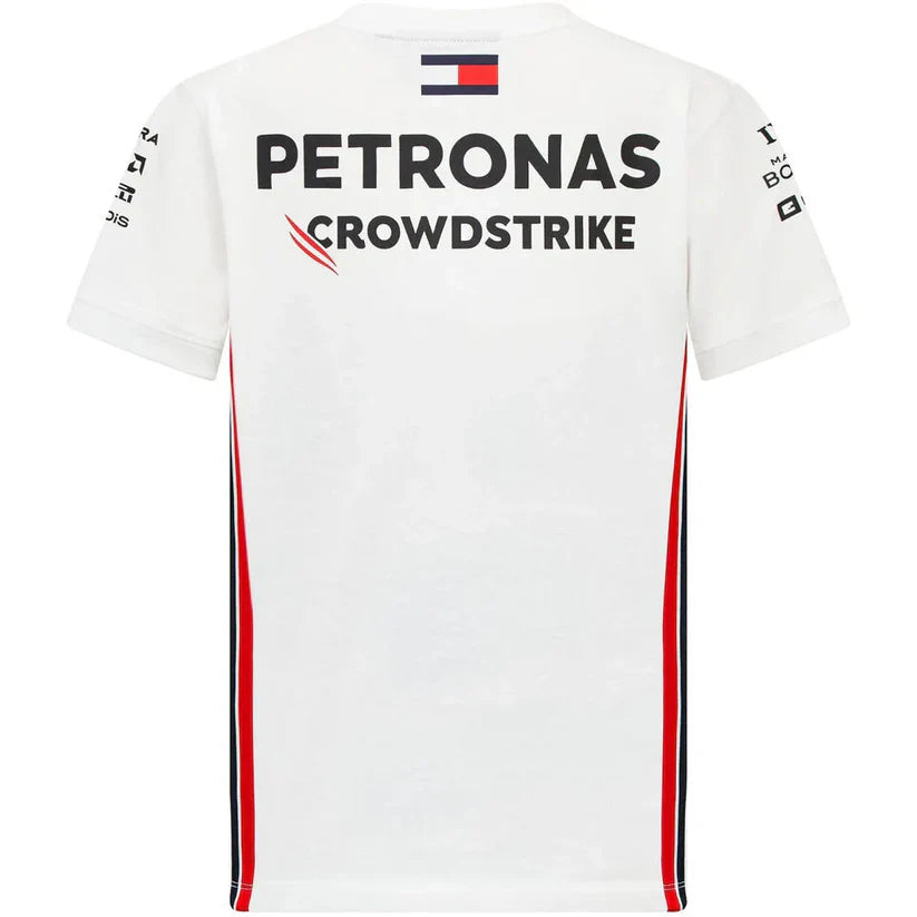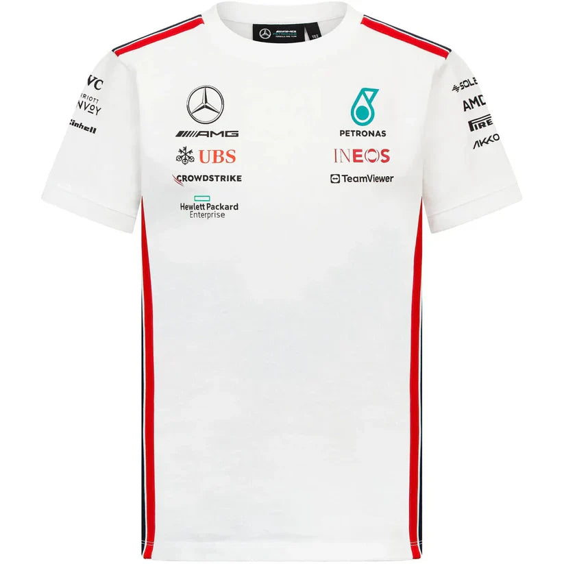 Dressed in a clean and crisp white color, the T-shirt seamlessly blends modern aesthetics with the rich heritage of Mercedes-AMG, symbolizing the team's unwavering commitment to precision, performance, and innovation on the racing circuit. The design features the distinctive logos and emblems of the team, creating a sharp and refined look.