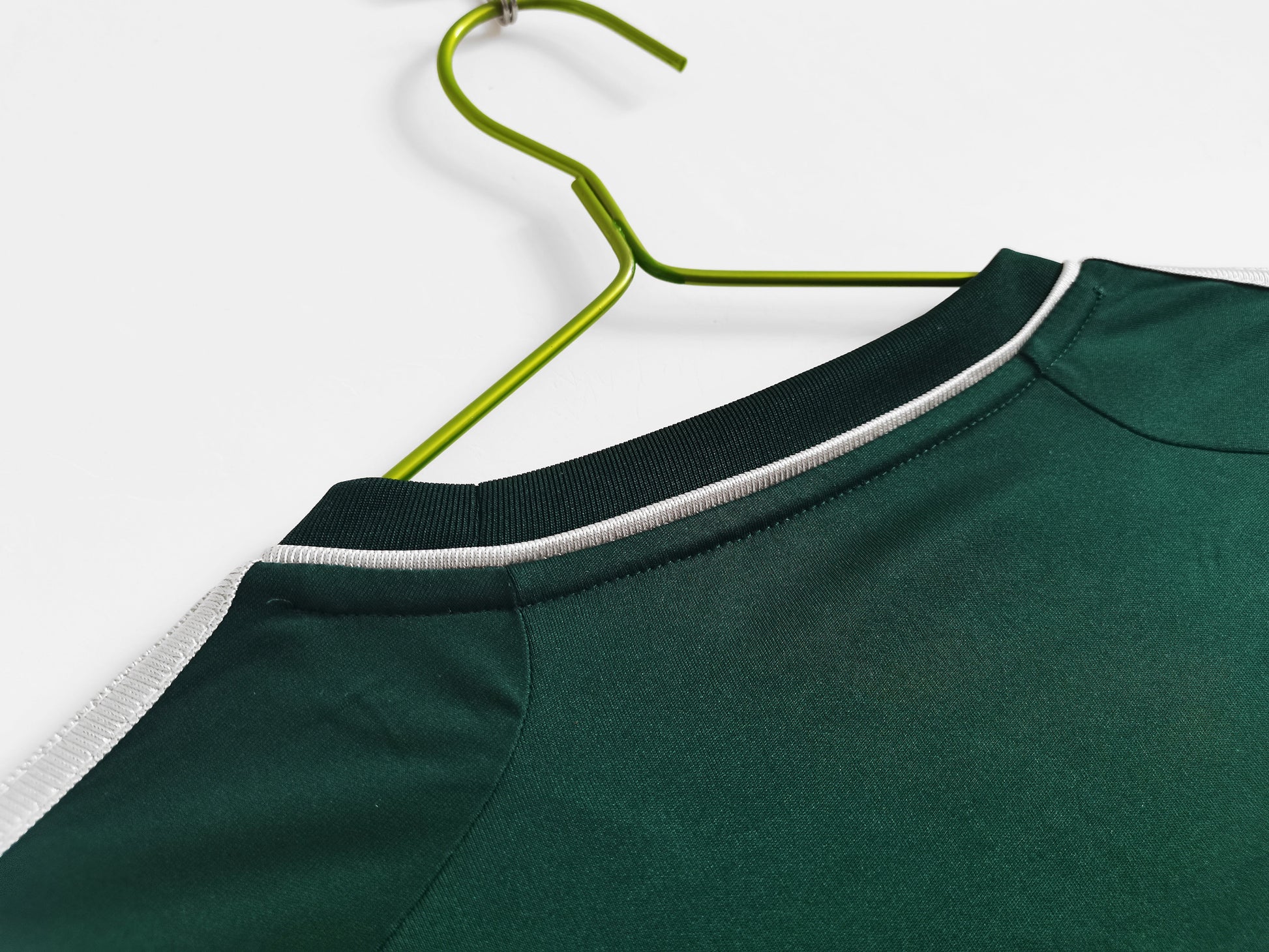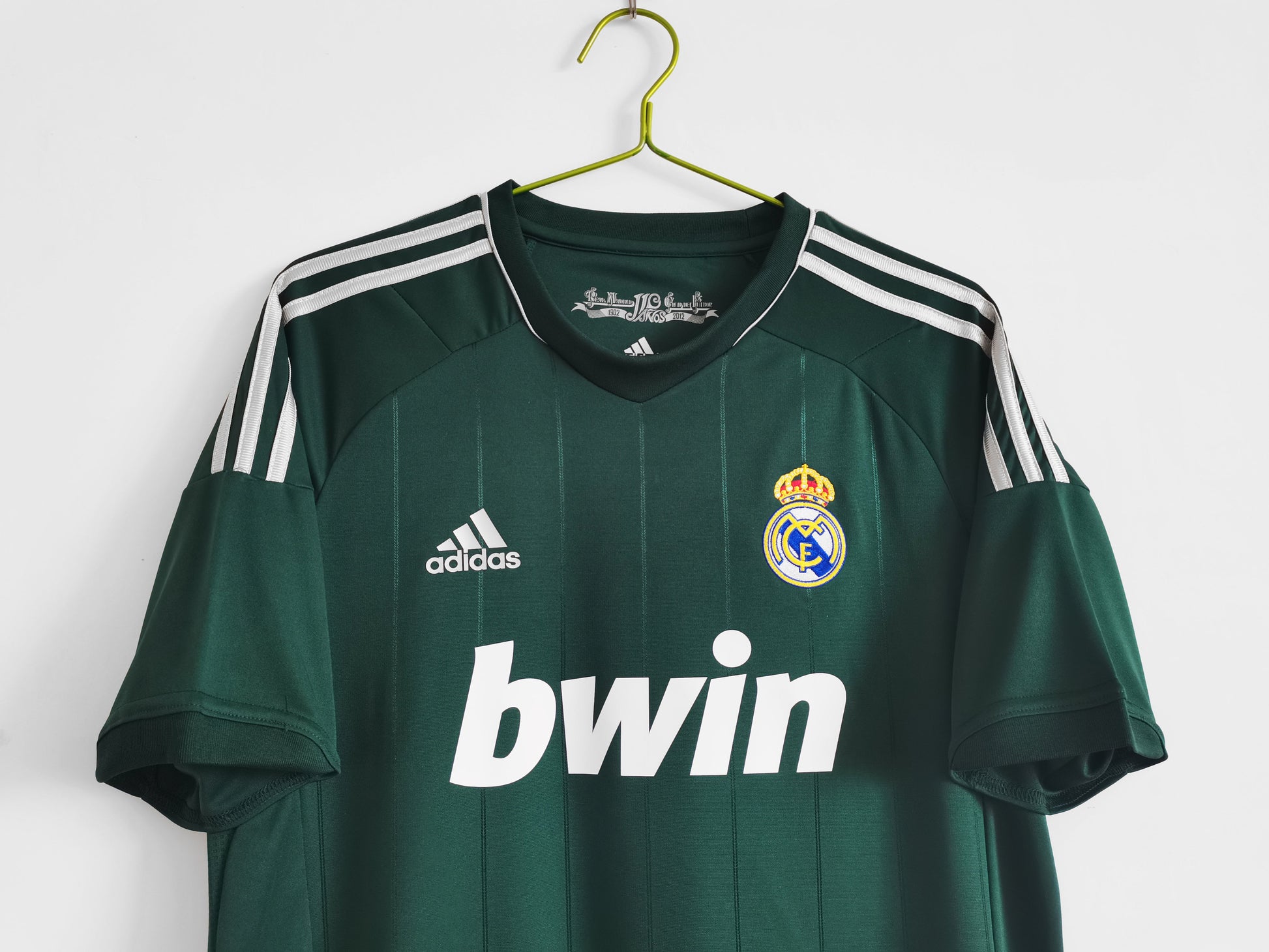 The Real Madrid away jersey for the 2012/2013 season featured a distinctive and elegant design. The primary color of the jersey was green, and the design typically included a diagonal stripe pattern across the front, creating a visually striking look with a gradient effect. The collar and cuffs were likely in a solid color, complementing the overall design. The sponsor's logo, often Bwin during that period, was prominently displayed in the center of the jersey. The Real Madrid crest was on the left chest, and the kit manufacturer logo, Adidas, was on the right chest. The jersey might have featured additional details, such as textured fabric or small design elements, contributing to its overall aesthetic.